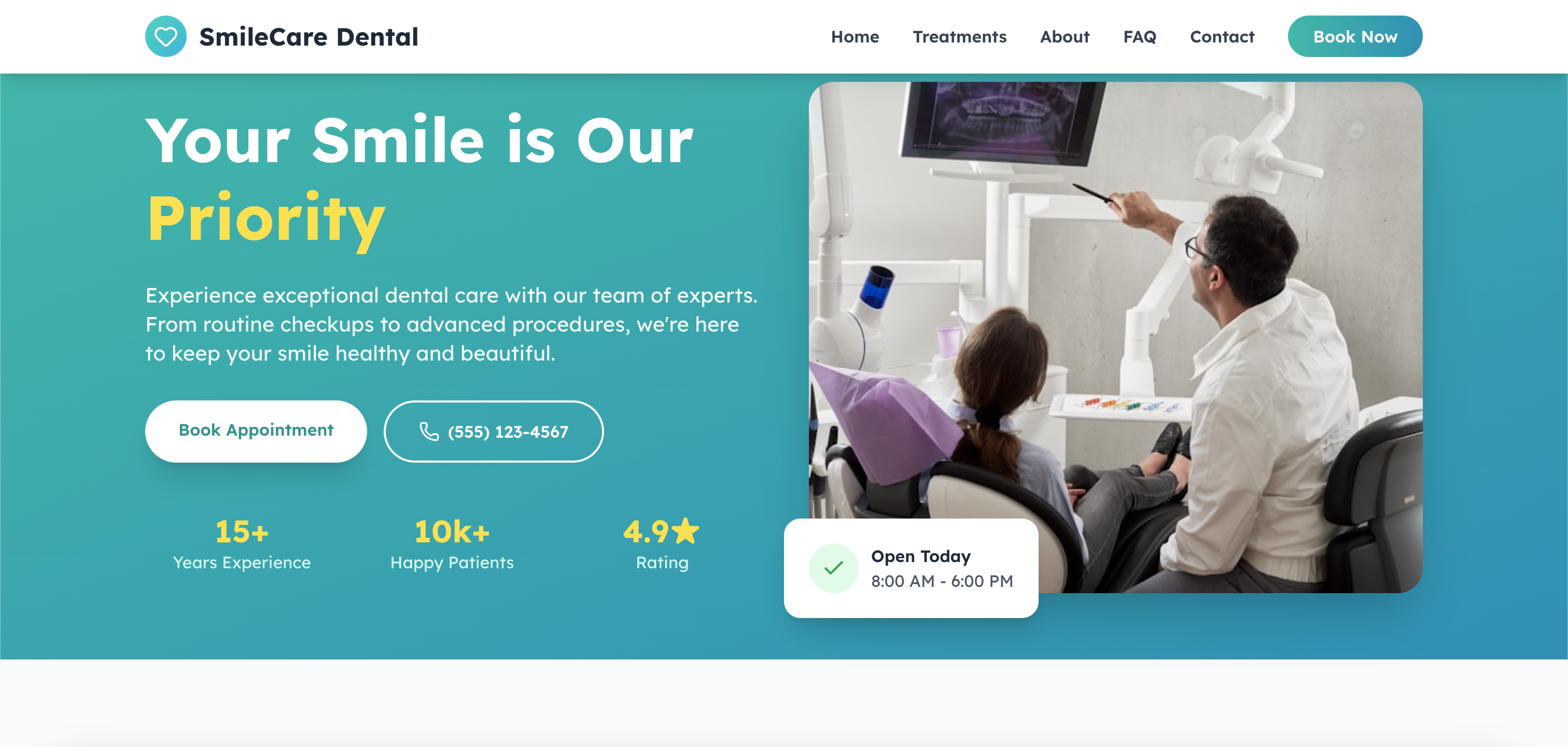 Modern dental practice website featuring comprehensive treatment information, patient testimonials, and easy appointment booking system.